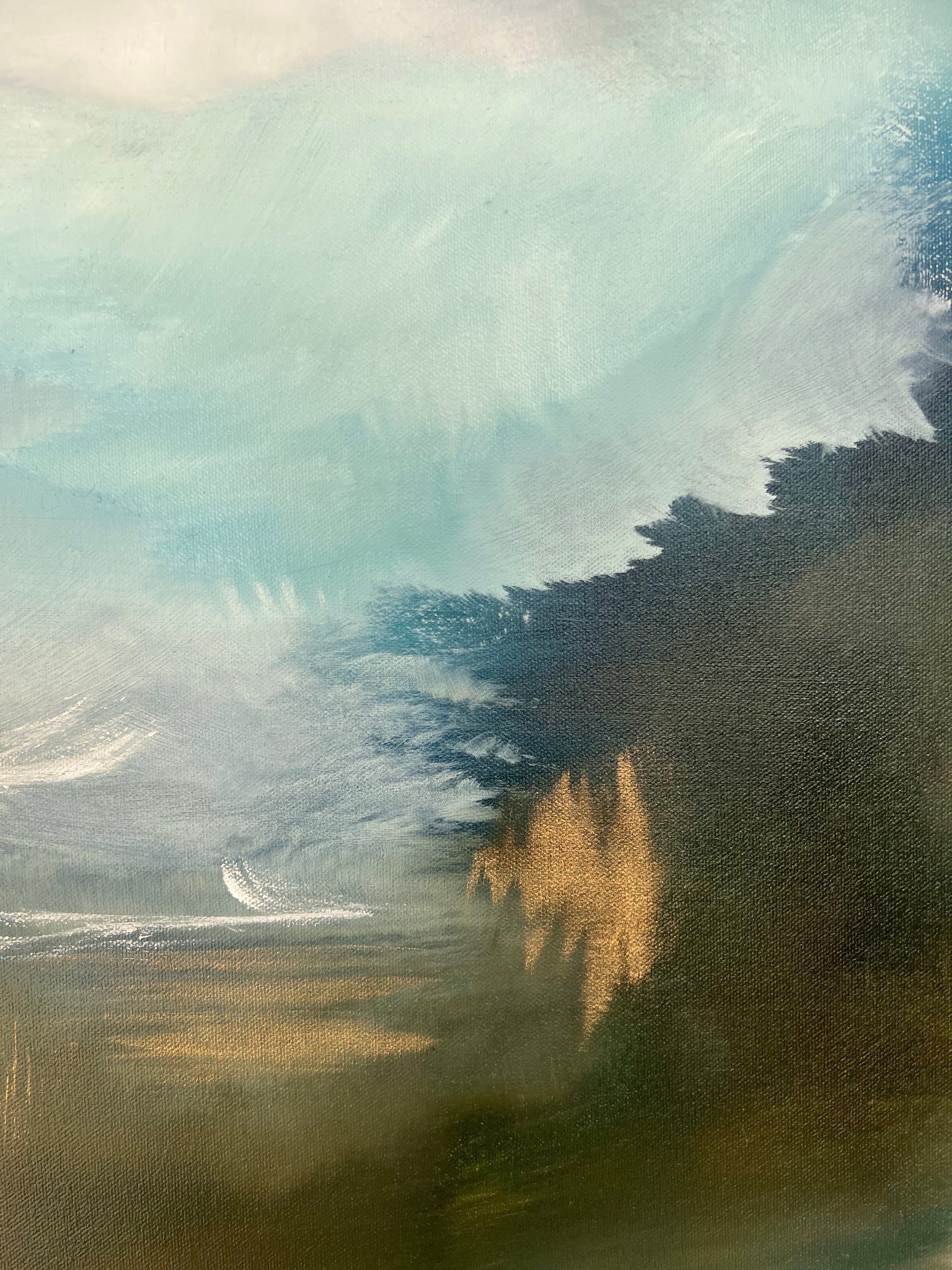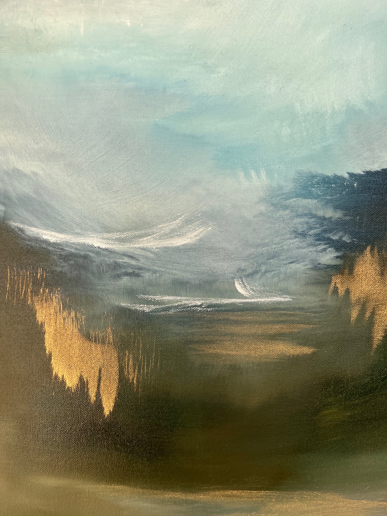 A dreamy place of mystery and coolness where the moon reigns. A perfect blend of cooler colors and golden accents. Enhance your interior with a 50x50cm oil painting on cotton canvas, featuring unique wall art and styling. Created by artist Sarah Campbell-Lloyd.